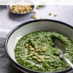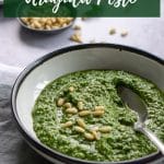 This arugula pesto sauce is a great alternative to basil pesto! Arugula is available year-round, and gives a great flavor when used to make pesto. Not to mention, it can be used on so many things! From gnocchi, to pasta, crostini, pizza/focaccia and more!