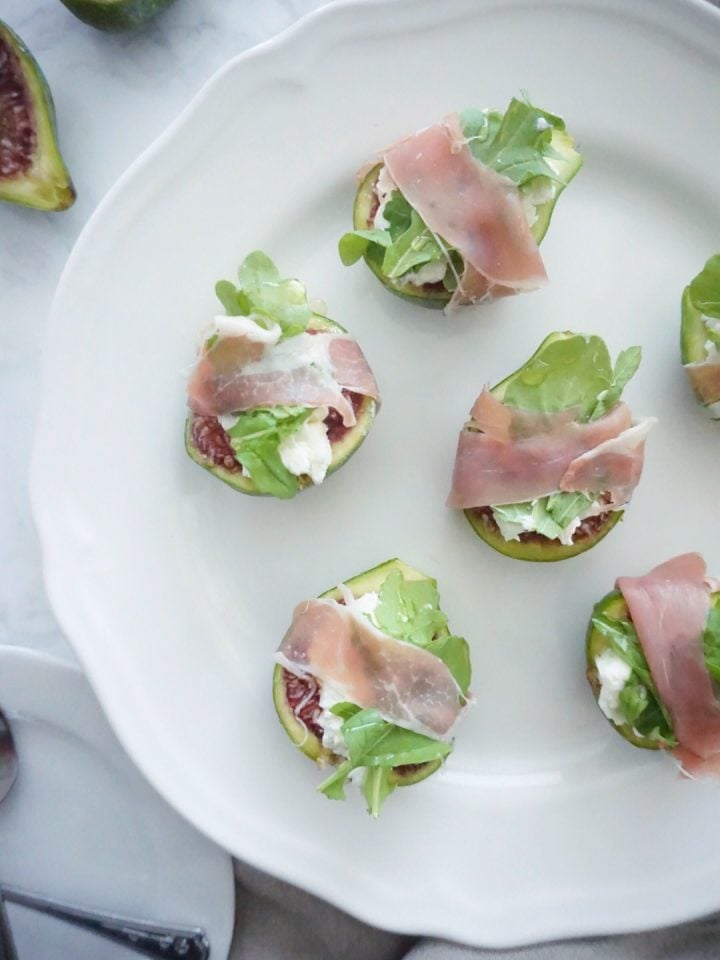 Figs with goat cheese, arugula, honey and prosciutto.