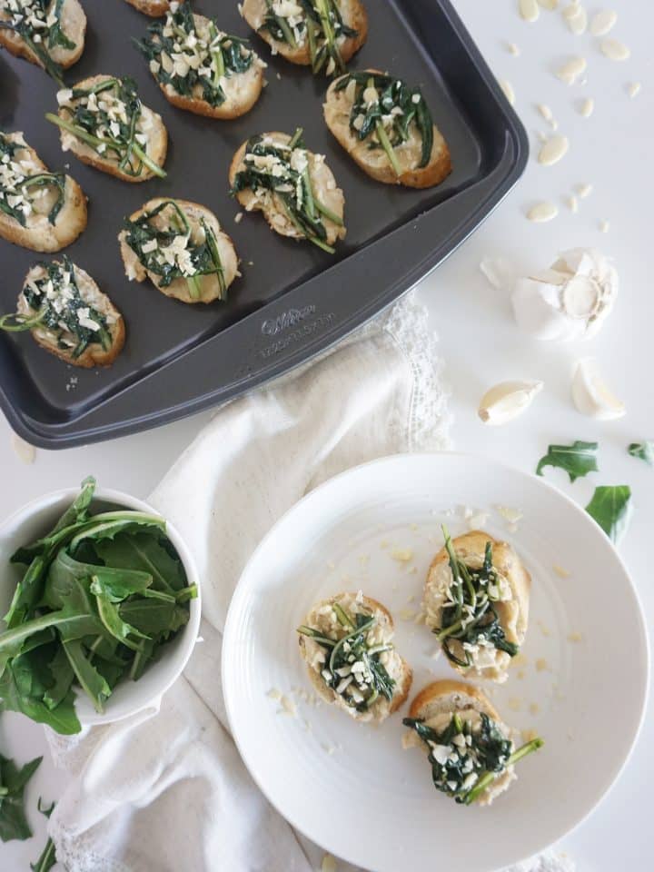 Crostini with white bean puree, sautéd cicoria and almonds