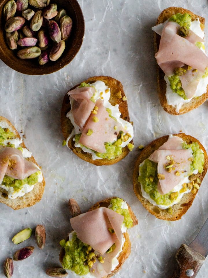 Burrata Crostini with Mortadella and Pistachio Pesto