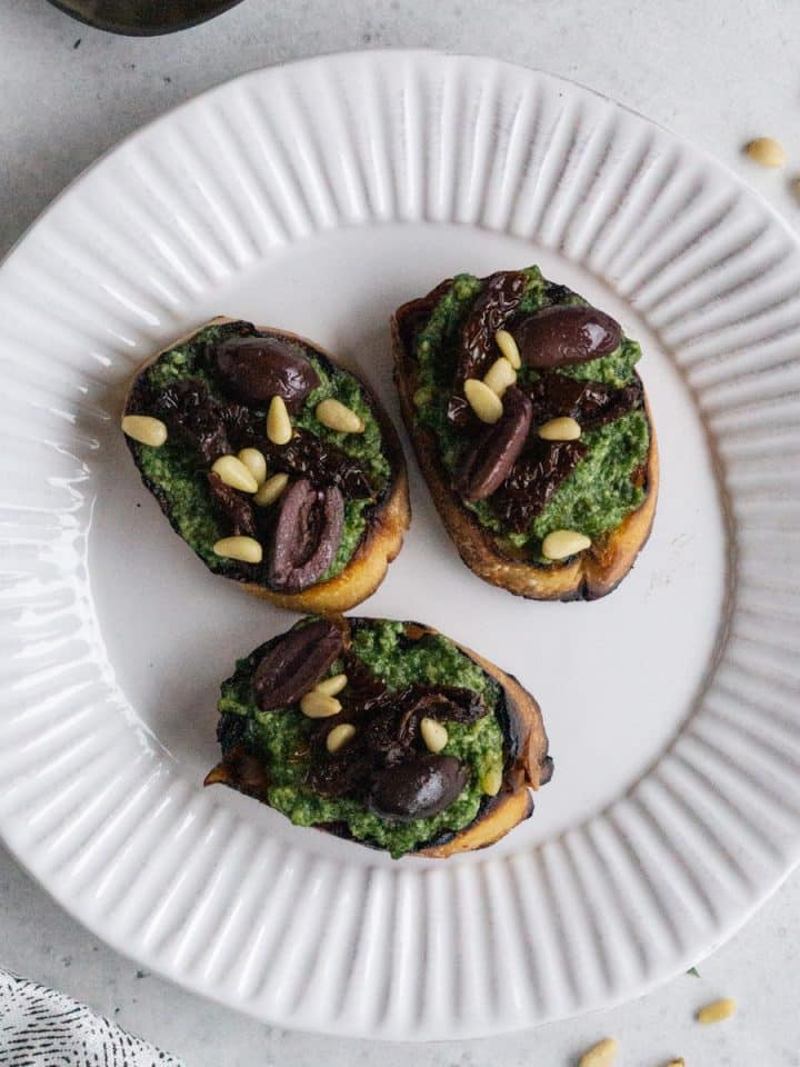 Pesto Crostini with Olives, Sun Dried Tomatoes and Pine Nuts