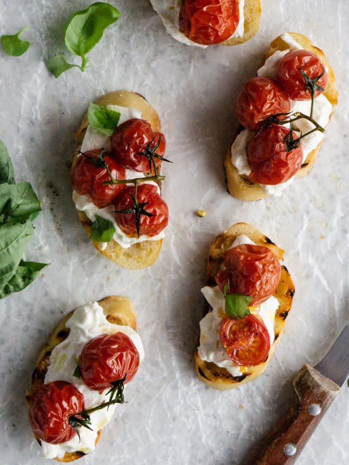 Roasted Tomato Crostini with Burrata and Basil