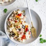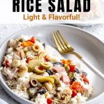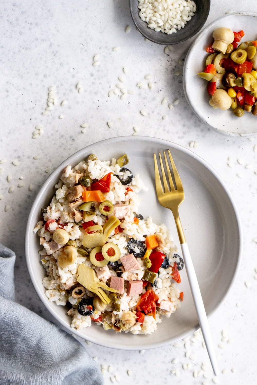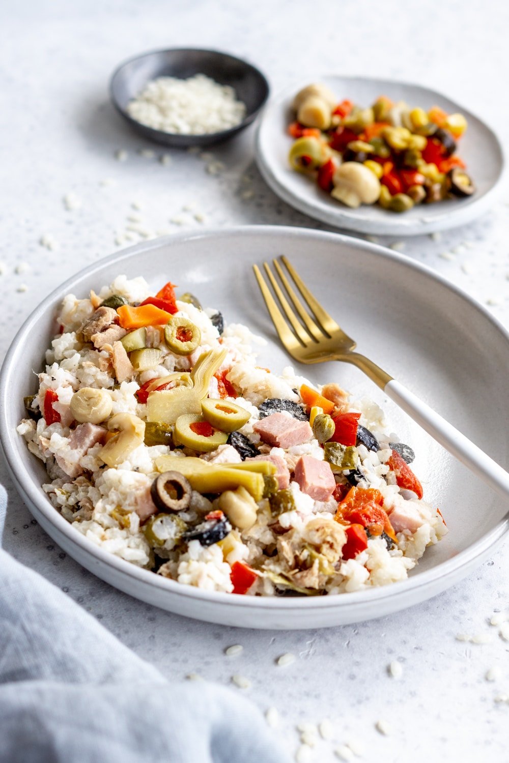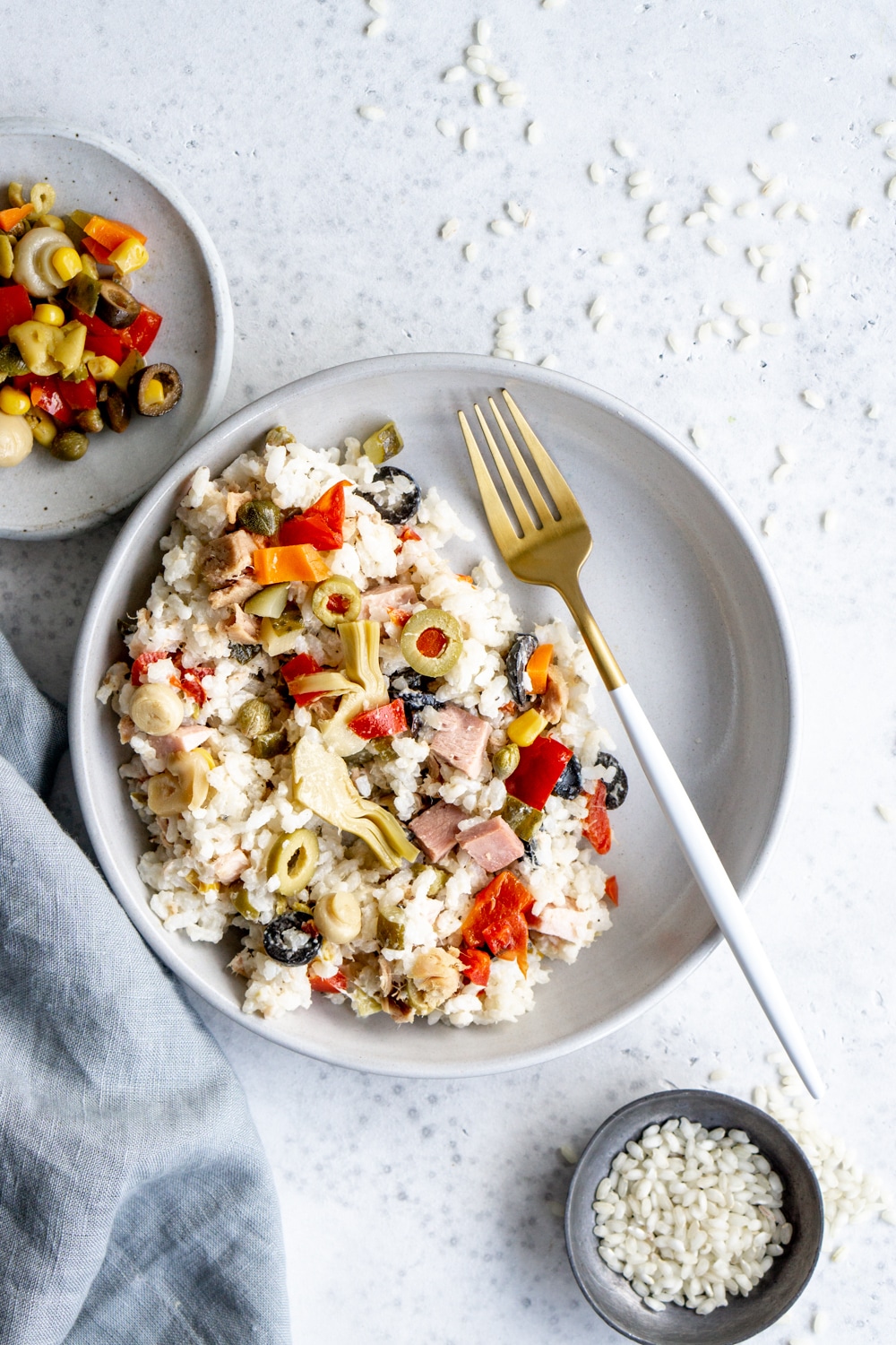 This recipe for tuna rice salad uses a very classic Italian combination of rice, canned tuna, mixed vegetables in a jar, and ham. But there are infinite options to customize your rice salad.