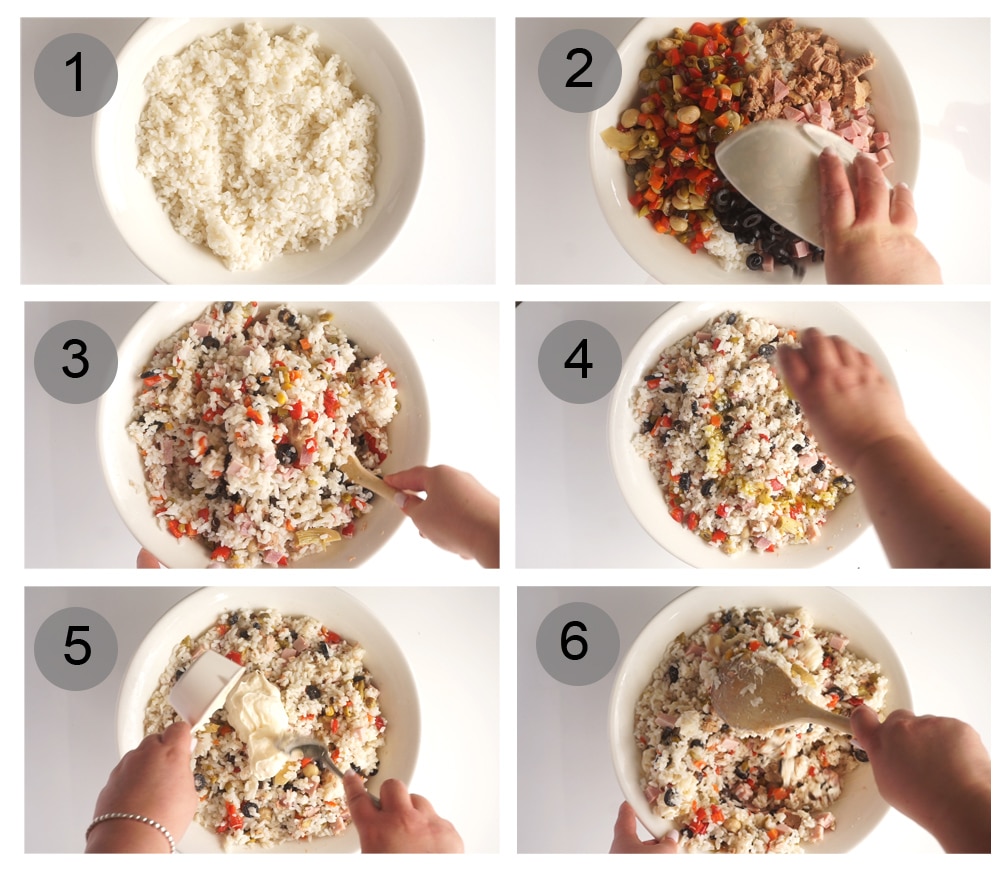 To the rice, add pickled vegetables (drained), tuna, ham, and olives. Mix in well with the rice. Add salt and pepper to your taste. Add olive oil and mix again.
