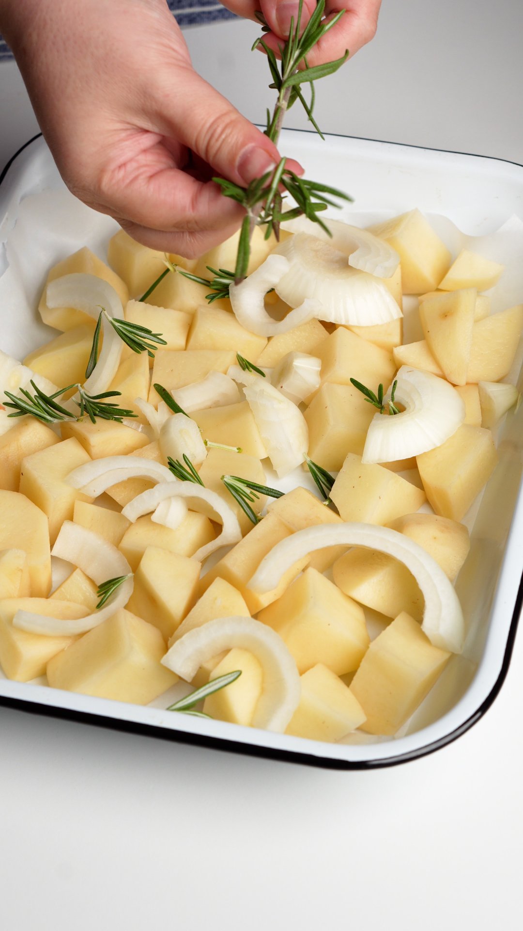 Prepare the vegetables: Peel the potatoes and cut them into large, uniform pieces. Add them to the prepared baking dish along with the onion rings and rosemary. Toss with olive oil, white wine, salt, and pepper.