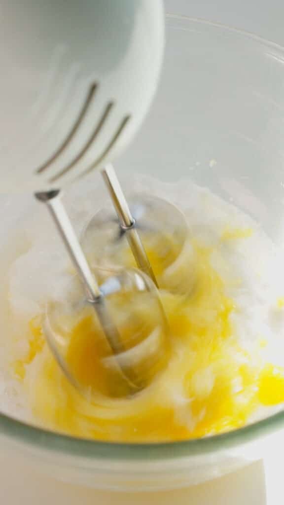 - Place the sugar and eggs in a large bowl and beat with a mixer until light and fluffy.