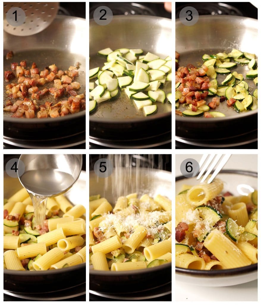- Add the zucchini to the pan, salt it lightly, and cook until tender, about 3 minutes. Add the pancetta back in.