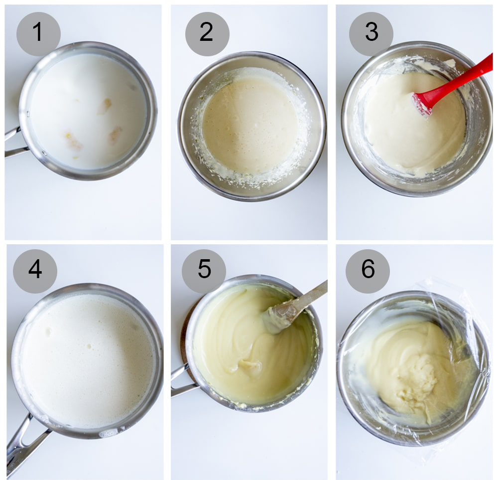 - Over medium heat, in a saucepan, heat up the milk, vanilla extract and lemon peel. Do not let it boil, turn it off right before it starts boiling. Remove the lemon peel and place to the side. Do no discard.