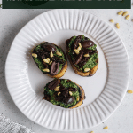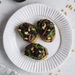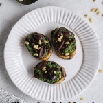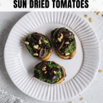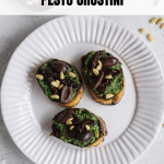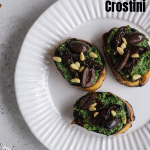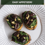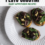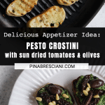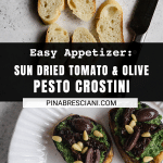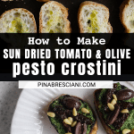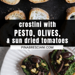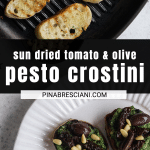 These pesto crostini make an amazing vegetarian appetizer! The briny flavor of the olives pairs perfectly with the salty sundried tomatoes and pine nuts.