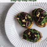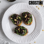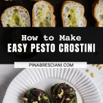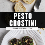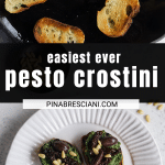 This crostini recipe is one of the easiest ever. I used homemade arugula pesto, but you can definitely use a store bought pesto. It's only a matter of grilling, baking or frying your bread (see my guide on how to make crostini), and adding the toppings, and the crostini are ready! It's that easy.