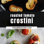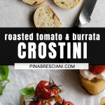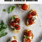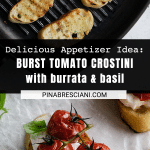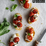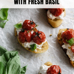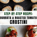 These roasted tomato crostini with burrata and basil make an amazing appetizer or snack. Once roasted, the cherry tomatoes become sweet as candy and add a deep flavor that will leave you wanting more!
