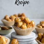 My mom likes to serve her struffoli in muffin liners, so that each person has their own individual portion, and I prefer them this way. The traditional way to serve struffoli is on a round dish or cake stand, and to form a wreath with the struffoli while they are still warm. I've even seen them just piled on top of each other on a dish. It's really up to you how you'd like to serve them!
