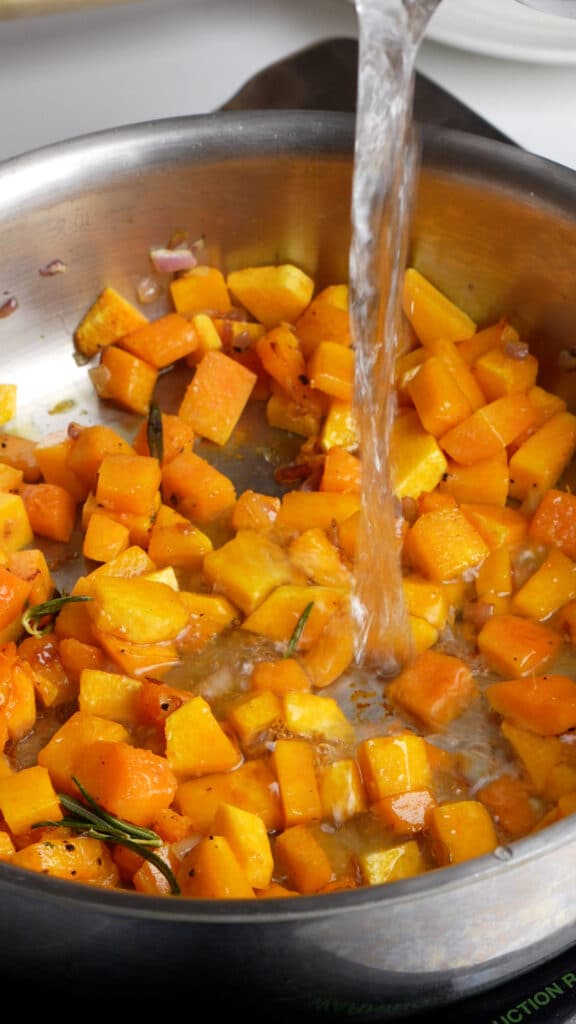 Add the butternut squash and let it cook until slightly caramelized. This adds flavor the soup.