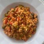 This is my mom’s vegetable risotto recipe– and it’s so delicious! Made with onions, carrots, celery, peppers, zucchini, peas, mushrooms, and tomatoes, it’s filled with vegetable flavor. This creamy risotto comes together in 1 hour for a cozy vegetarian dinner.