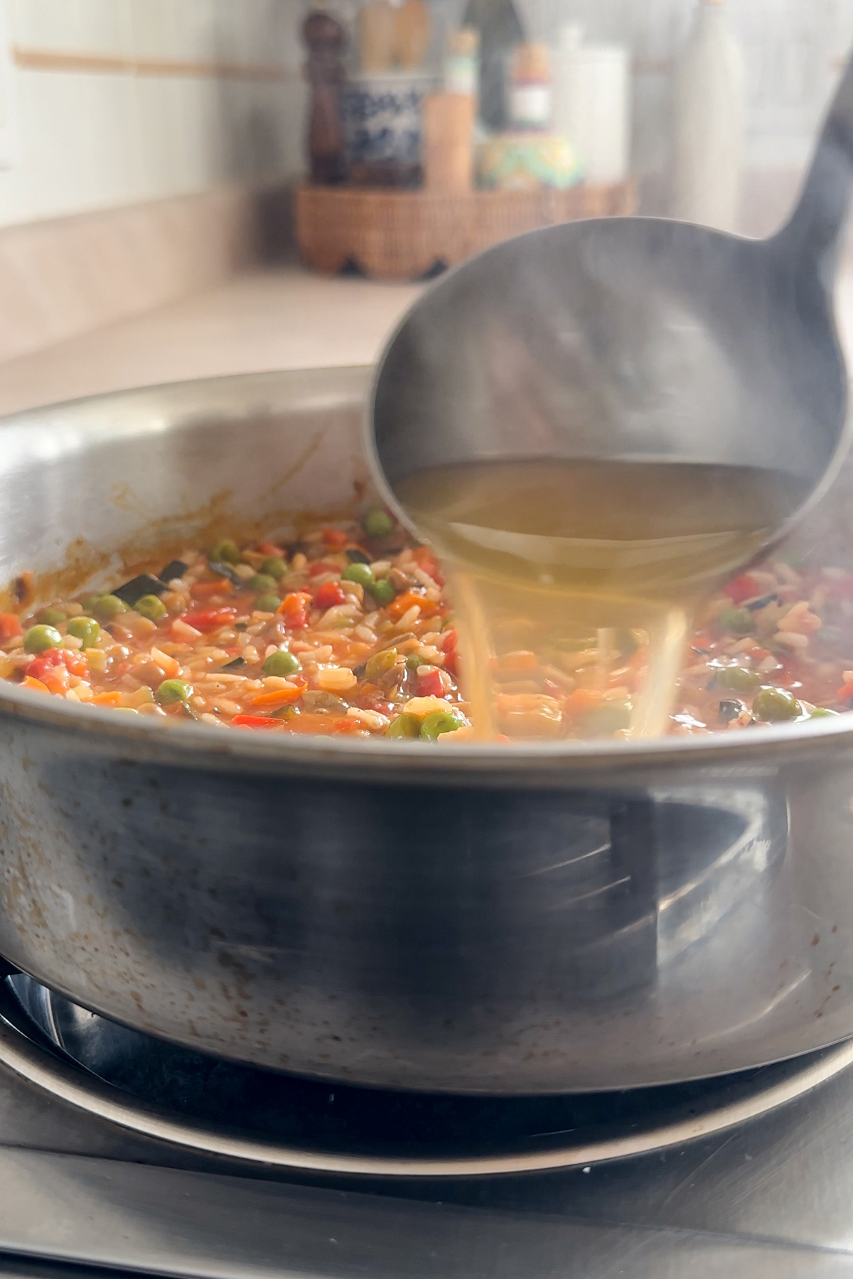 While the vegetables are cooking, slowly heat up the vegetable broth.